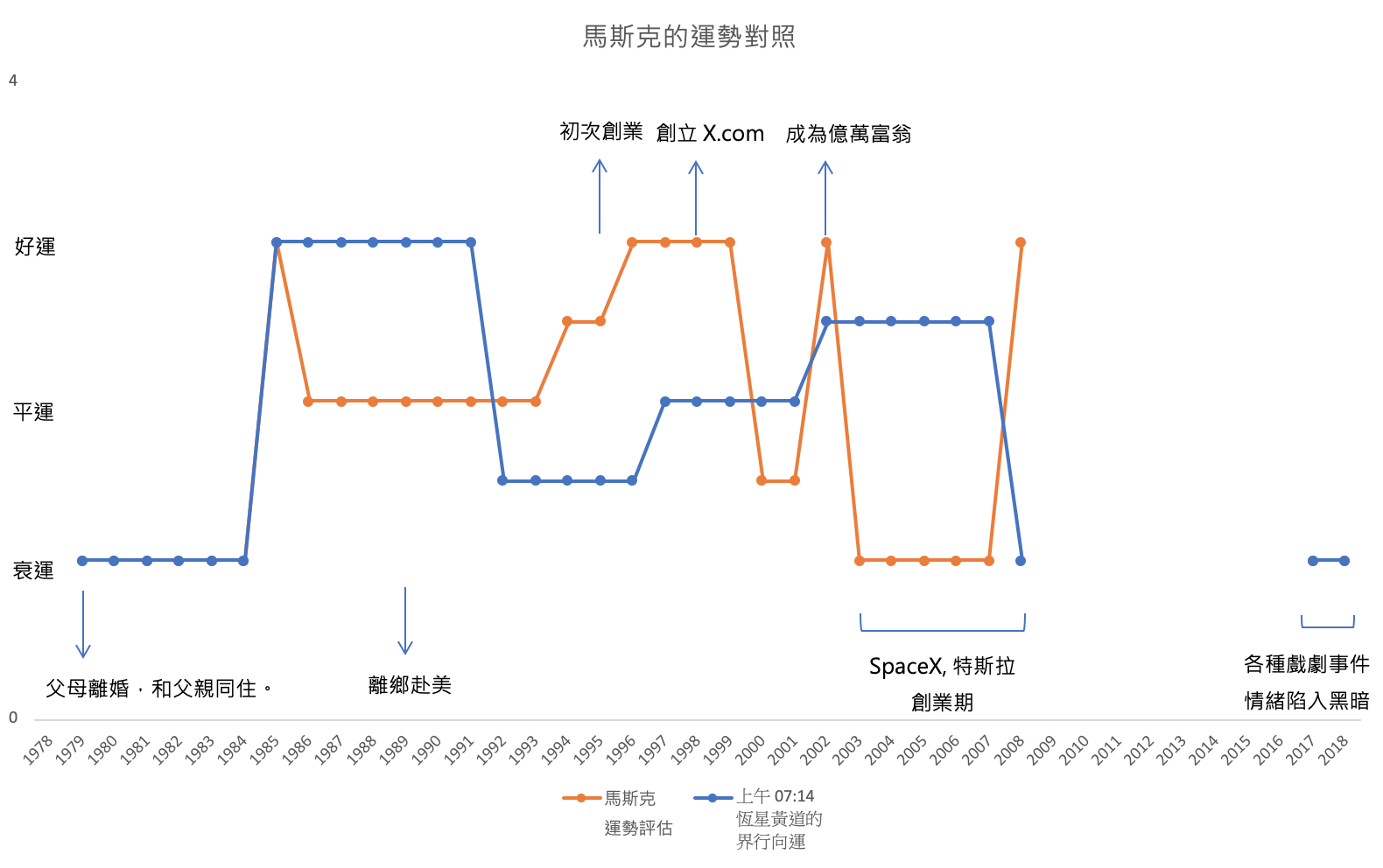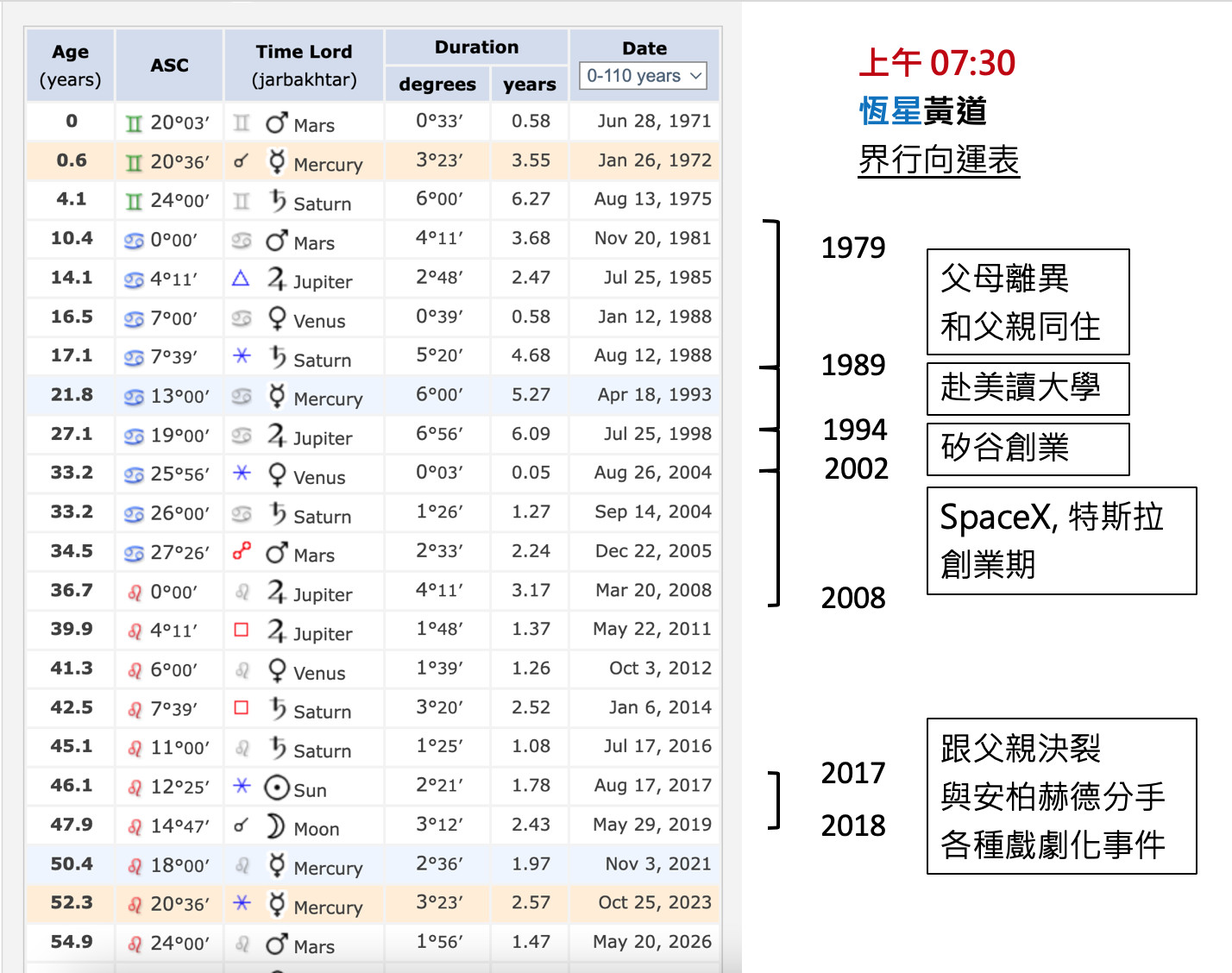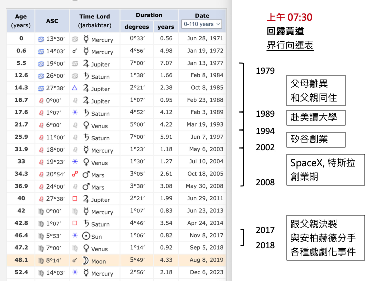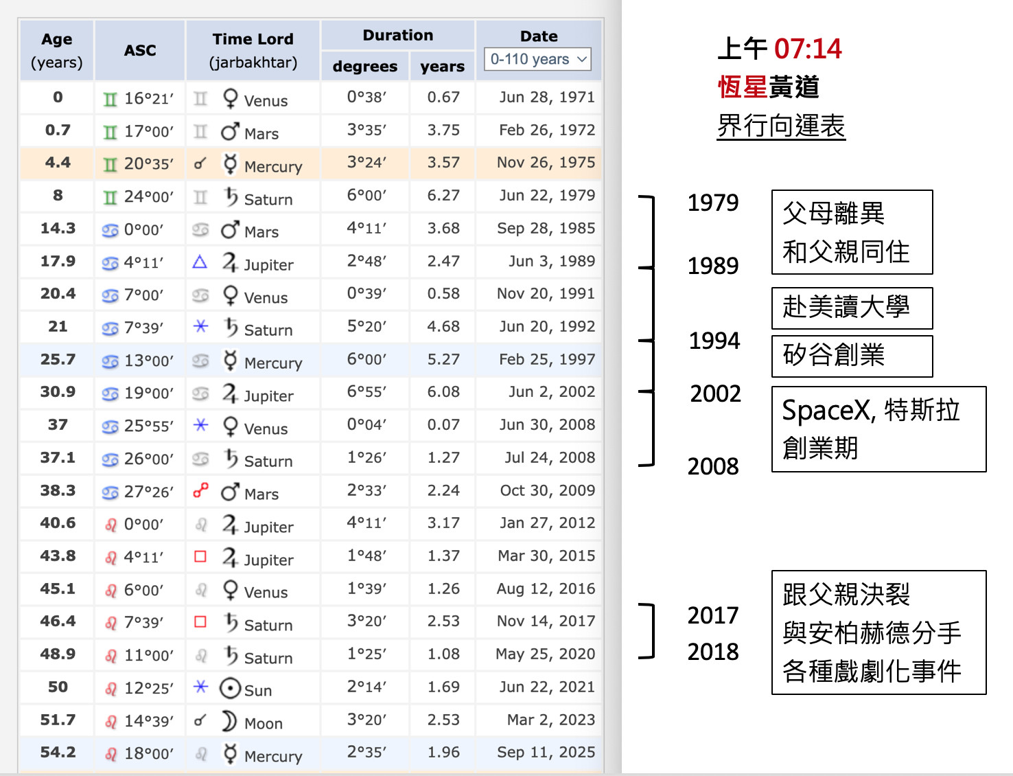 這個界運表有幾個時間點,都跟馬斯克人生階段的轉折幾乎契合。