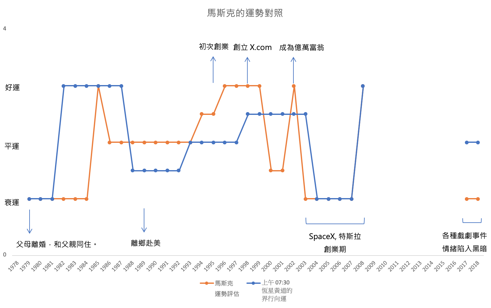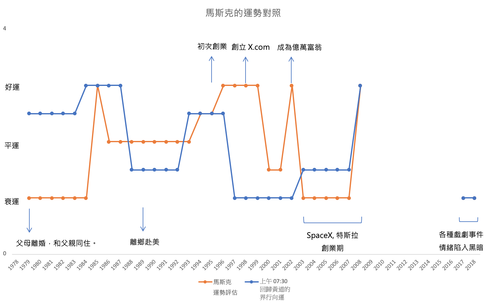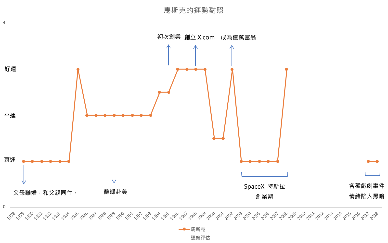 為方便後續對照,我們將馬斯克的運勢起伏,簡化成折線圖來表示。