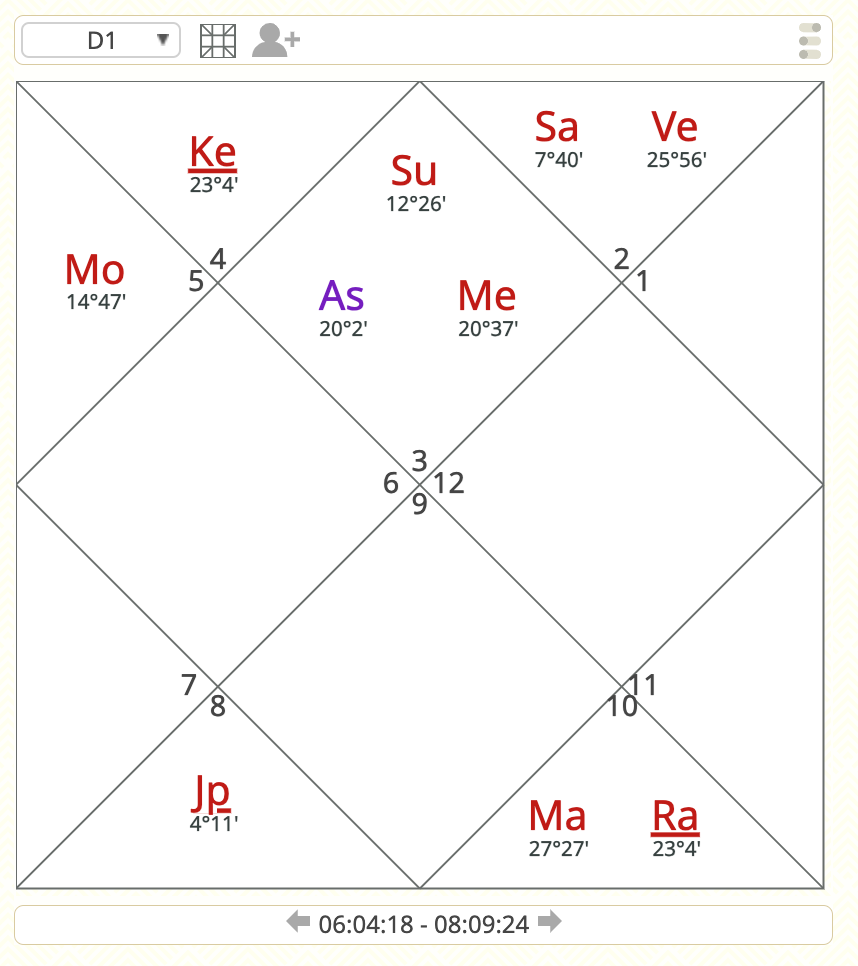 首先,我們用印度占星經典 BHPS 的流年法來確認本命盤的上升星座。
