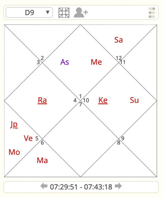 而 太陽 Su 在 D9 盤又與 南交點 Ke 同宮,象徵了最後跟父親決裂的關係。