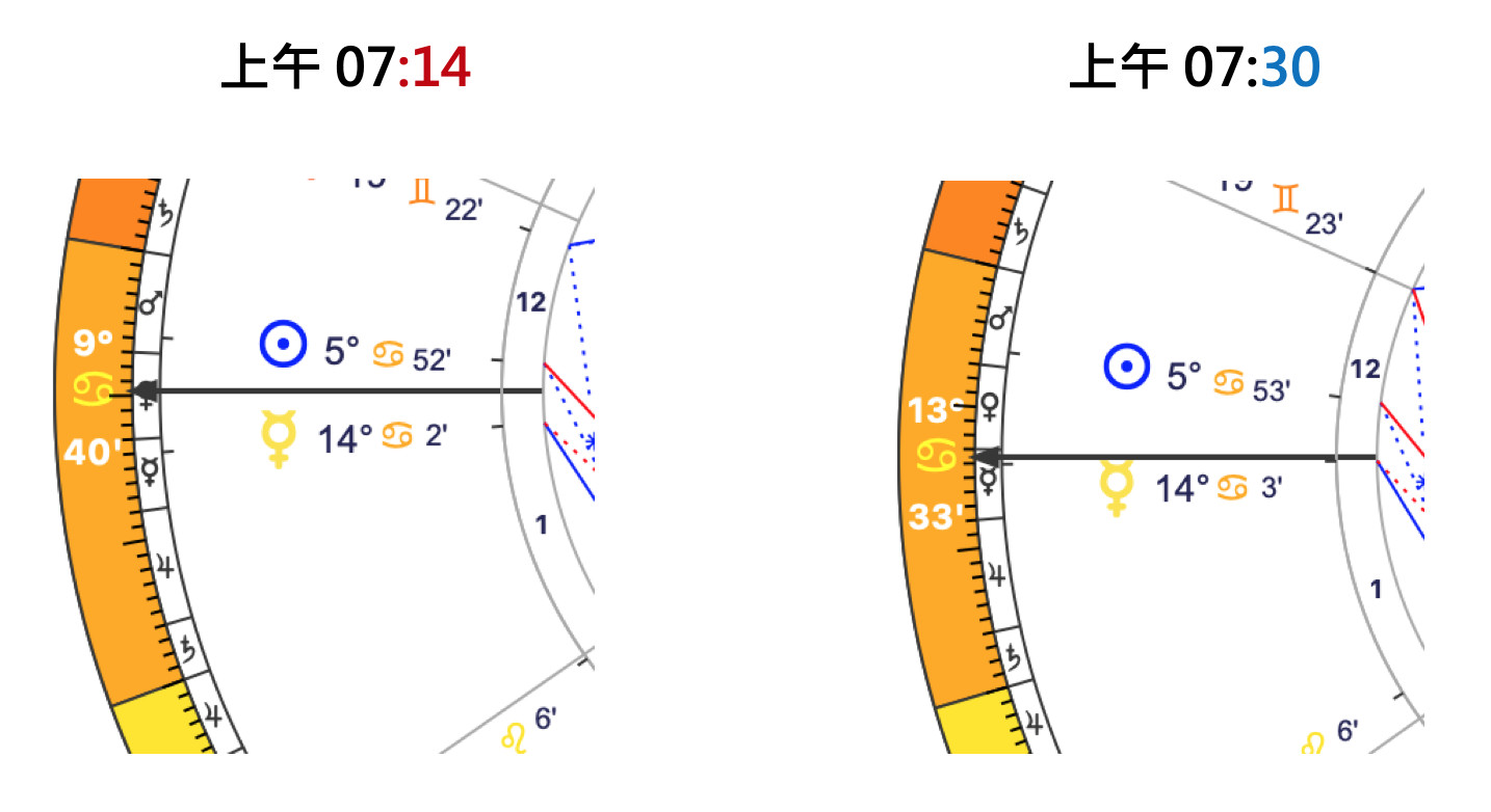 07:14 跟 07:30 這兩個星盤的差異,主要是 太陽 跟 上升點 的距離。